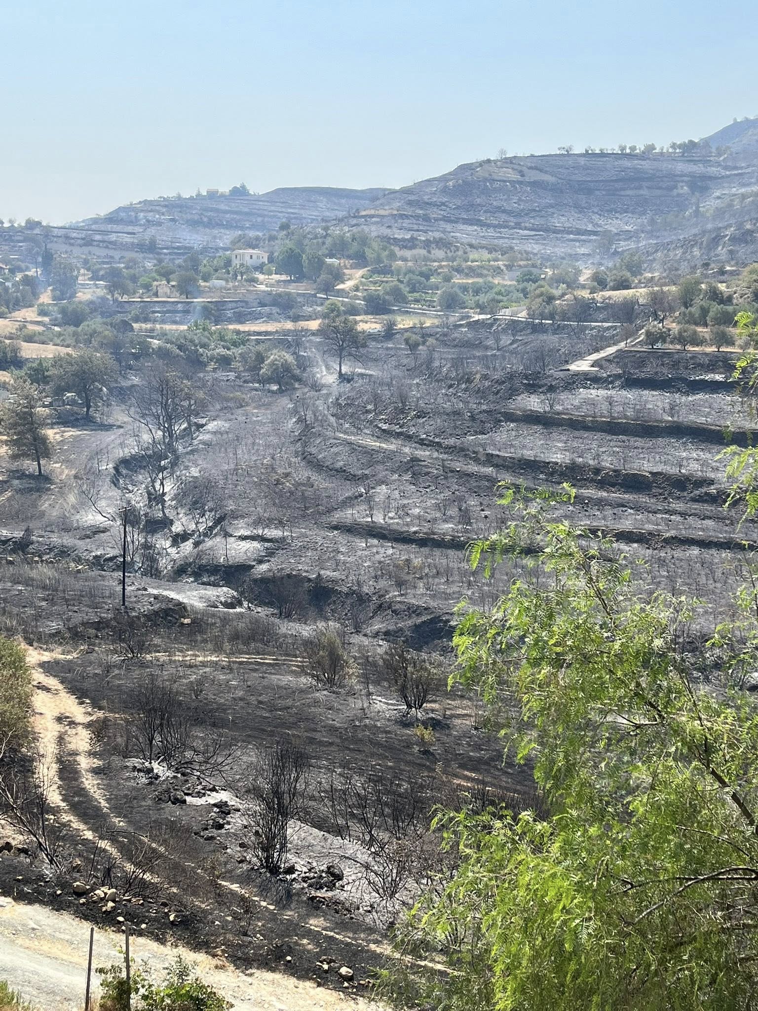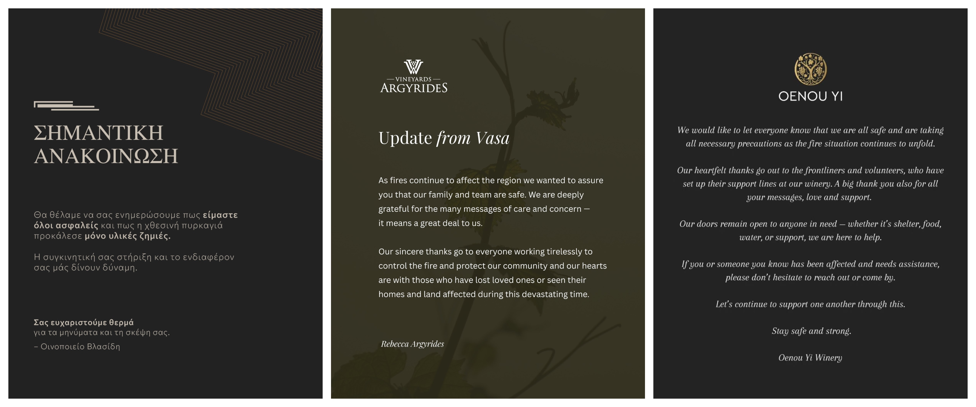 Όσο περνούσε η μέρα, ένα-ένα τα οινοποιεία της περιοχής (Zambartas, Vlassides, Argyrides, Ayia Mavri, Oenou Yi, Gerolemo κ.λπ.) με αναρτήσεις τους μάς ενημέρωναν ότι είναι ασφαλείς, πλην όμως μιλούσαν για καταστροφές, για τις οποίες όμως δεν γνωρίζαμε ακόμα για το μέγεθός τους. Ο Παγκύπριος Σύνδεσμος Οινοχόων έγραψε σε ανάρτησή του για «τους αμπελουργούς και τους οινοπαραγωγούς που έχασαν αμέτρητα στρέμματα αμπελώνων», το βίντεο του ιδιοκτήτη του οινοποιείου Linos στο Όμοδος, ο οποίος φανερά και δικαιολογημένα ήταν σε απόγνωση κυκλοφορούσε μαζικά στο διαδίκτυο, όπως και οι φωτογραφίες από το οινοποιείο Παπαϊωάννου στη Βάσα Κοιλανίου -και τα δύο οινοποιεία έπαθαν μεγάλες ζημιές από τη φωτιά. Μάλιστα, ο Παπαϊωάννου δημοσίευσε και ορισμένες πολύ θλιβερές εικόνες, δείχνοντάς μας καμένα αμπέλια, τα οποία όλως παραδόξως ήταν καλλιεργημένα και καθαρά από άγρια βλάστηση. Το μένος και η δύναμη της φωτιάς παρόλα αυτά τη βοήθησαν να περάσει μέσα από τον αμπελώνα και να τον καταστρέψει ολοσχερώς, όπως ο ίδιος μας ενημερώνει στο βίντεο.