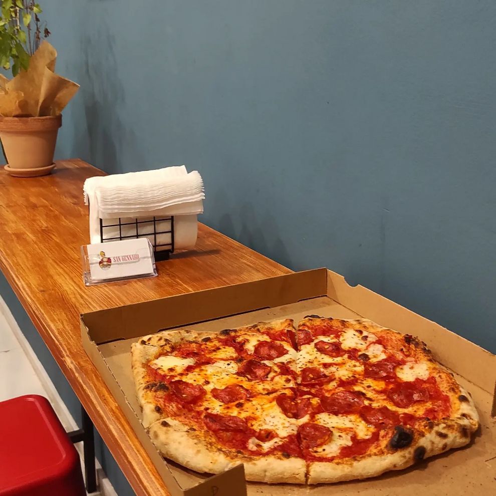 Στο μενού υπάρχει μια επιλογή από 13 διαφορετικές πίτσες, σκορδόψωμο και calzone (με γέμιση σοκολάτα και φράουλα ή μπανάνα), τα οποία ο κόσμος απολαμβάνει μέσω take away ή επί τόπου στα λιγοστά τραπέζια, ενώ σύντομα θα προσφέρονται και μέσω delivery.