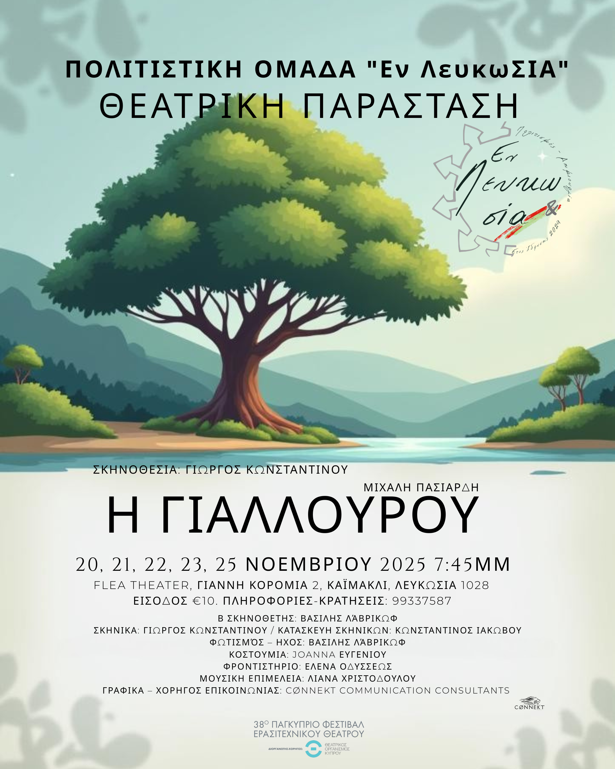 Η Πολιτιστική Ομάδα «Εν ΛευκώΣία» παρουσιάζει φέτος τη θεατρική παράσταση «Η Γιαλλουρού» του Μιχάλη Πασιαρδή, σε σκηνοθεσία Γιώργου Κωνσταντίνου, στο Flea Theater (Καϊμακλί, Λευκωσία), στις 20, 21, 22, 23 και 25 Νοεμβρίου 2025, ώρα 7:45 μ.μ.