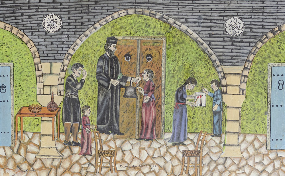 “Τα Θεοφάνεια, του κορυφαίου Κύπριου Ναϊφ Μιχαήλ Κάσιαλου. Εκτιμώμενη τιμή: €25 000 – €40 000”Στα Θεοφάνεια η οξυκόρυφη, στατική ιερατική φιγούρα δεσπόζει στον χώρο. Γύρω της, το περιβάλλον πάλλεται από μεστό χρώμα και δονείται από ακανόνιστα σχήματα. Δάπεδο, αψίδες, πύλες και φιγούρες μοιάζουν να συνενώνονται σε ένα ενιαίο σύνολο. Έτσι, η σύνθεση μεταμορφώνεται σε ένα ονειρικό και μεταμορφωτικό περιβάλλον, όπου η προοπτική παίζει με γραμμές και χρώματα.