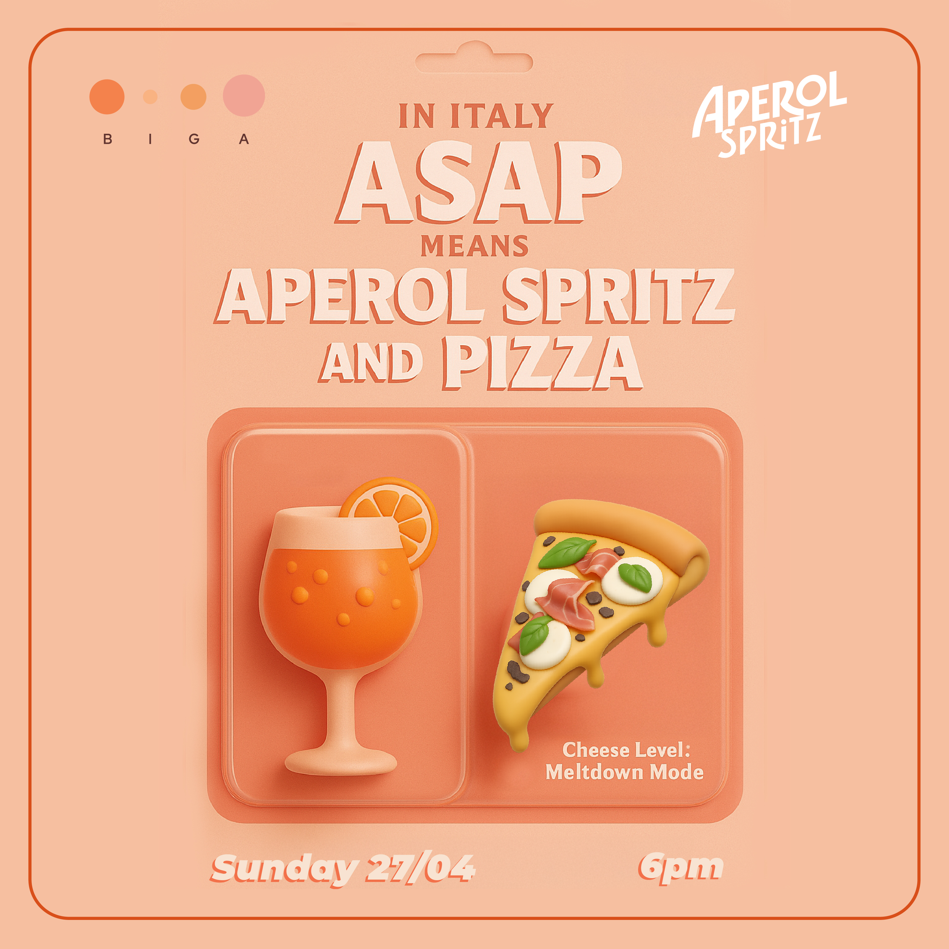 «ASAP στην Ιταλία σημαίνει Aperol Spritz And Pizza και εμείς φέρνουμε αυτή την ενέργεια στο Biga, την Κυριακή 27 Απριλίου».