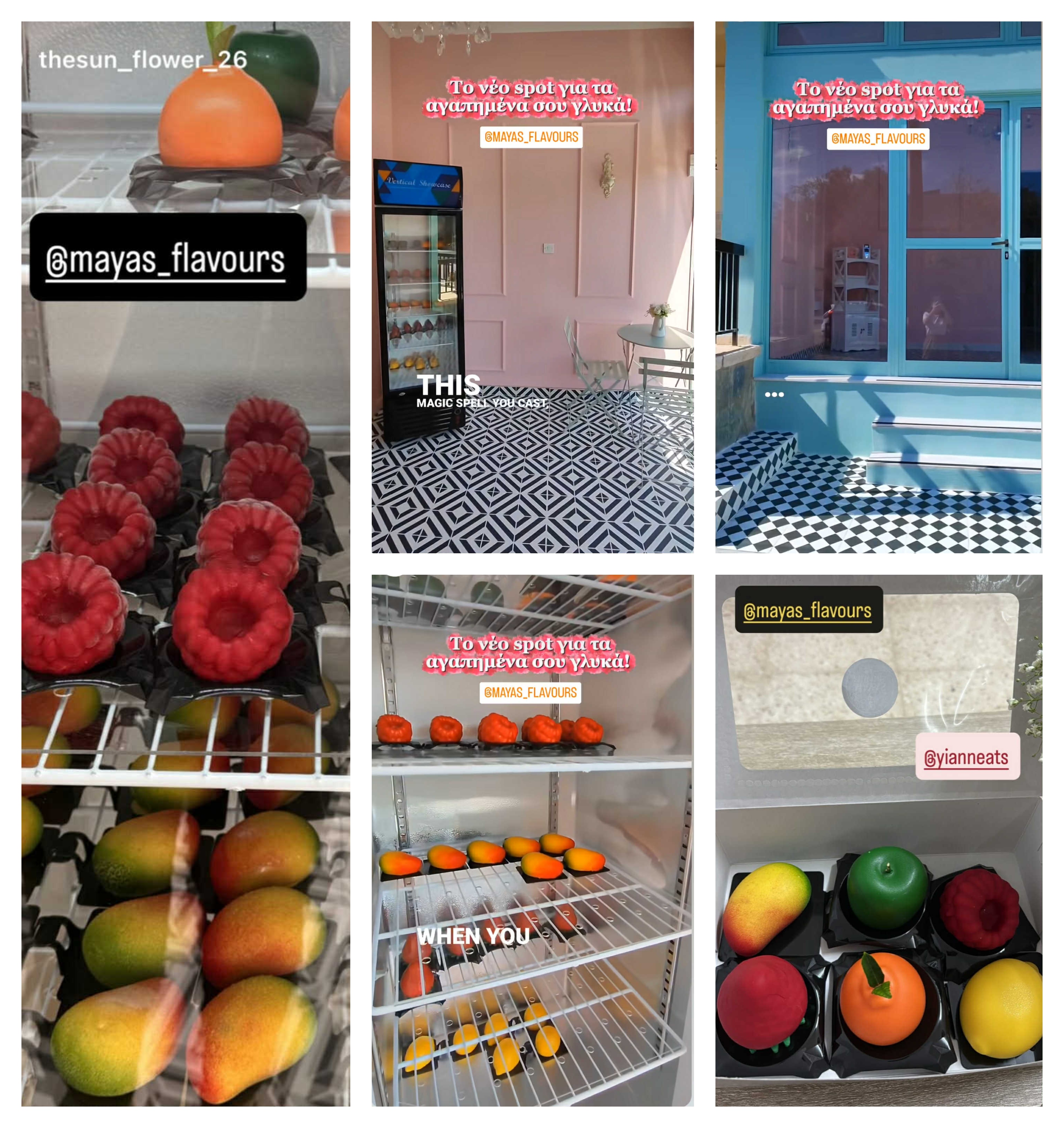 Πλέον λοιπόν τις επτά γεύσεις, σχήματα από Maya’s Flavors μπορούμε να τις βρούμε μαζεμένες στα ψυγεία του καταστήματος στα Λατσιά, σε έναν χώρο με ωραία χρώματα όπου πρωταγωνιστές είναι τα trompe-l'œil fruit desserts.