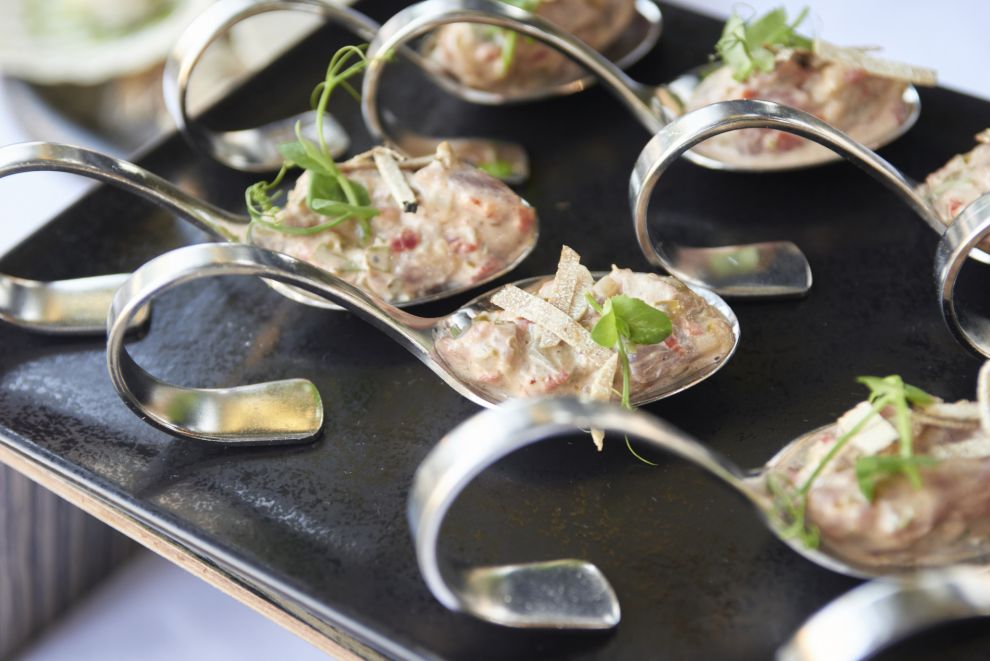 Οι επισκέπτες γεύτηκαν πρώτα ένα λεπτό «φάκελο» γαρίδας με χαβιάρι Harenga και edamame, ακολουθούμενο από ένα γήινο «κέικ» παντζαριών με ελαφριά κρέμα τόφου, τάρτα από χρένο και δροσιστικό σορμπέ ακάι.