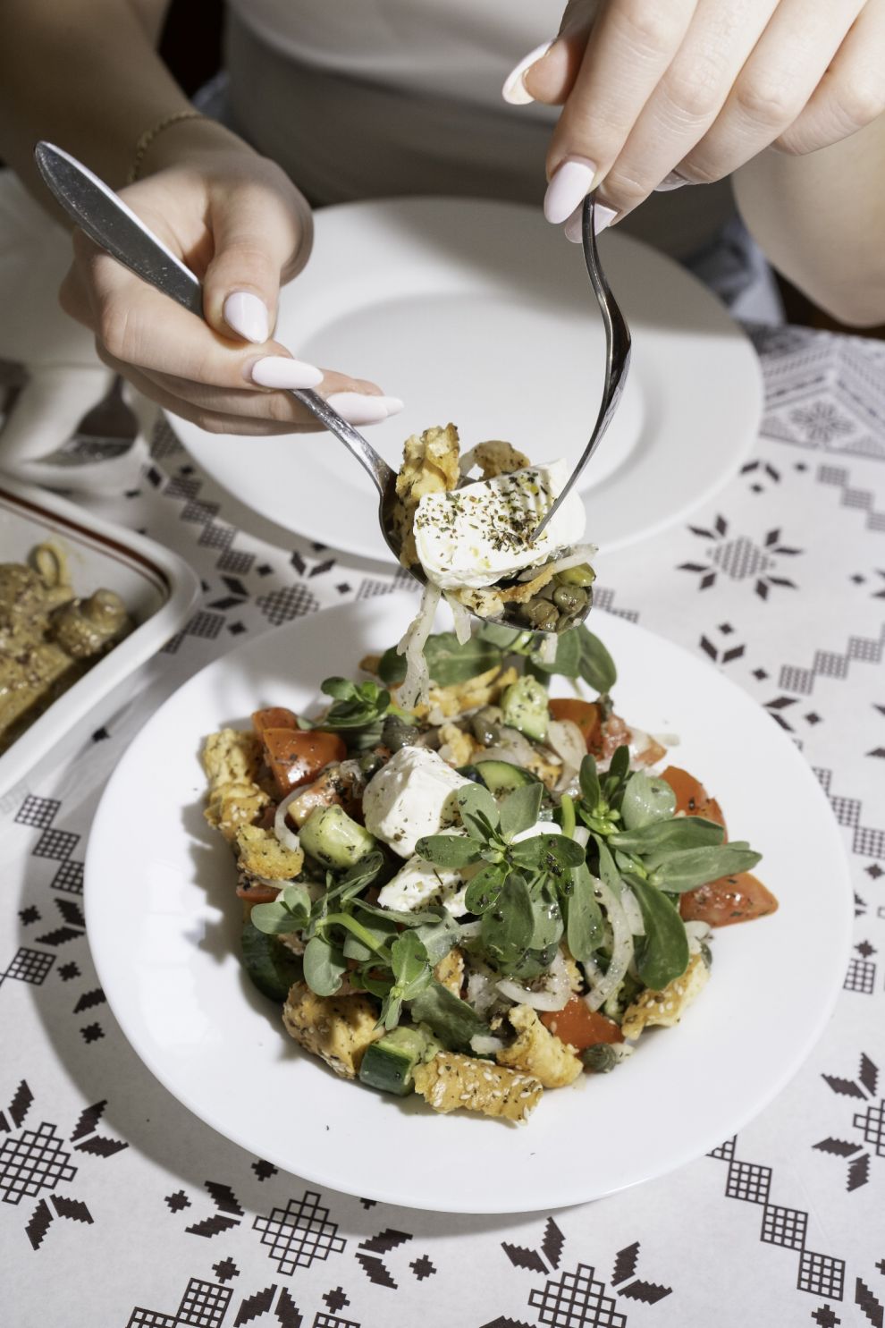 Ανάμεσα στις σαλάτες που προσφέρονται στο μενού, για παράδειγμα, ξεχωρίζει αυτή με φρέσκια ντομάτα, γλιστρίδα, κρεμμύδι, καππάρι, «γλισταρκά» με σουσάμι και αιγοπρόβειο χαλίτζι. Η ιδέα της σαλάτας, μας λέει ο Σταύρος, προέρχεται από τον ελληνικό ντάκο, δοσμένη όμως με κυπριακή προσέγγιση.