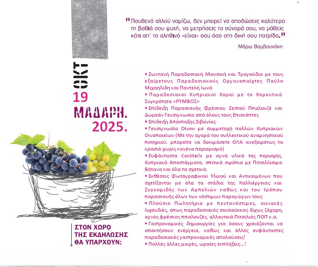 -Εκθέσεις Φωτογραφικού Υλικού και Αντικειμένων που σχετίζονται με την Καλλιέργεια και Συγκομιδή των Αμπελιών καθώς και του τρόπου παρασκευής όλων των νόστιμων παραγώγων τους