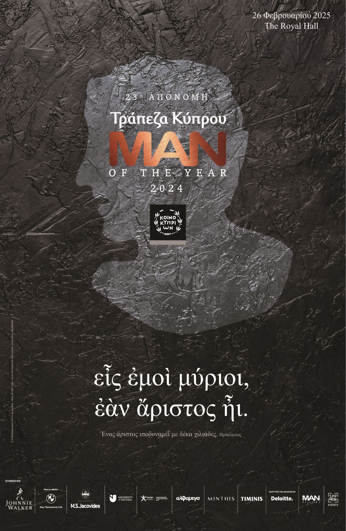 Στις 26 Φεβρουαρίου 2025, στο The Royal Hall στη Λευκωσία, θα πραγματοποιηθεί η λαμπερή τελετή βράβευσης των Αρίστων της Χρονιάς 2024 «Τράπεζα Κύπρου Man of the Year Awards». H 23η απονομή των αρίστων. Των ταλαντούχων, μετριοπαθών, με ηθική υπόσταση. Τα ορθά πρότυπα. Άντρας.
