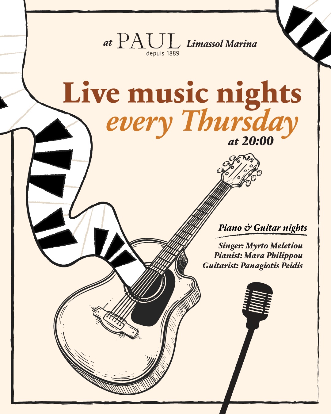Η PAUL Limassol Marina με χαρά ανακοινώνει μια σειρά από ζωντανές μουσικές βραδιές, οι οποίες θα πραγματοποιηθούν κάθε Πέμπτη κατά τη διάρκεια των μηνών Νοεμβρίου και Δεκεμβρίου. Οι επισκέπτες θα έχουν την ευκαιρία να απολαύσουν μοναδικές μουσικές στιγμές με την ερμηνεία της Μυρτώς Μελετίου, συνοδευόμενη από καταξιωμένους μουσικούς.